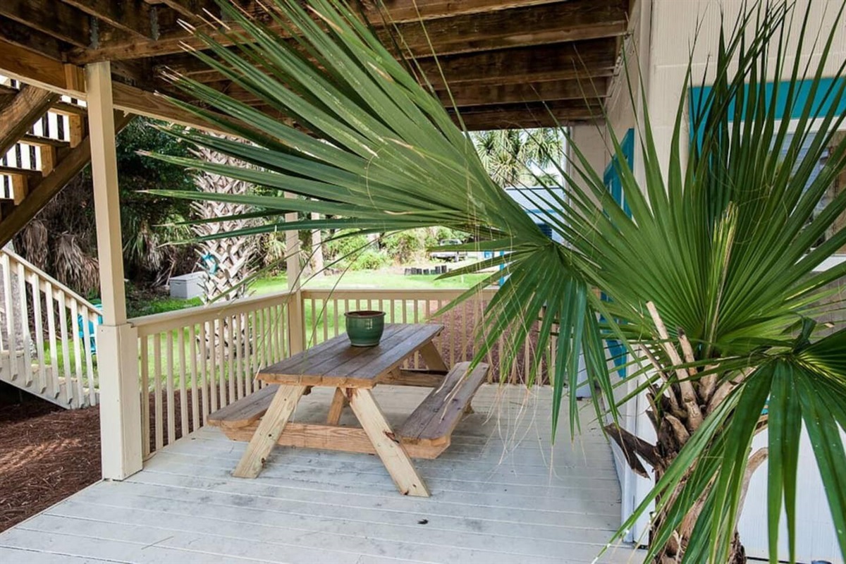 Lower level of a duplex. Fun colors, newer appliances and lots of other updates make it a comfortable space. Wavy floors and older siding may deter those looking for a new home but the comfortable classic is a great place for those looking to enjoy a true Folly stay. Two large bedrooms with Queen beds, living room with sleeper sofa(best for Kids) and daybed on the front enclosed porch provide for decent sleeping options. One bath is attached to one of the bedrooms and the other isn't. Sleeps up to 6 but wouldn't advise more than four adults if you want to have your own space and still enjoy shared areas.